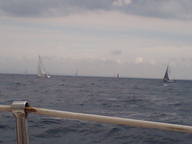 すると左から西風のブローが現れました。すでにスタート時刻は過ぎていましたがこのブローは非常にラッキーです!スタート」ラインを切って走り出しましたが正面に無風に捕まって止まってる船が団子状態です。スタボに返して避けますが今度は正面にアウターマークです。またもやポートに返して風をつかみますが、今度は風が右に戻りスタボー艇のケツをなめる結果になってしまいました。風は安定せずにきまぐれに振れまわります。下ヒールをつくりながらこつこつ走りますが、なかなかいい風がきません。