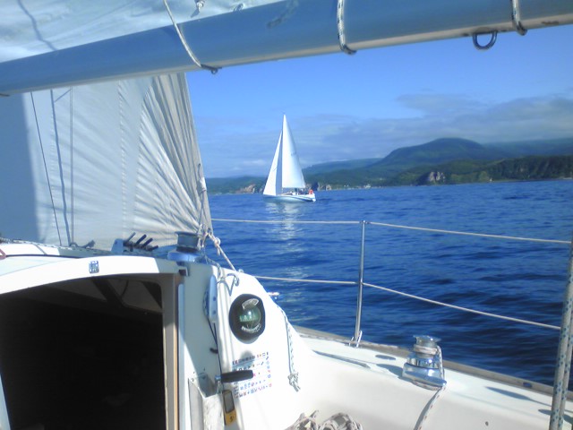 5〜6艇の集団に追いつき、このままブッチギリかと思いましたが気まぐれな風に翻弄されて叶わぬ夢となってしまいました。それでも何艇かは視界にとらえつつレースは続きます。夜半過ぎからから雨が降り出し、最悪なコンディションでしたが明るくなる頃には風が吹き出して残り十数マイルの地点で突然大きな破裂音とともにブームが折れました。丁度もうひと頑張りしようとバイオ燃料の補給中だったのですが気をとりなおして折れたブームを外す作業にとりかかりました。シートをクリューからとって一応トリムできるようにしたのですが幸いアビームの走りでしたのでレース続行です!この後のロールコールでブーム破損の報告をするとリタイアせずに続行するのでね?と念をおされました。雨がひどくなり、視界も怪しくなってきてフィニッシュまであと数マイルの地点でまたもや後ろから迫るヨットの影。ブームの無いメインセールではスピード勝負などできるわけがないのですがここで負ける訳にいきません。なんとかリードを守り、21時間と18分でフィニッシュしました。
